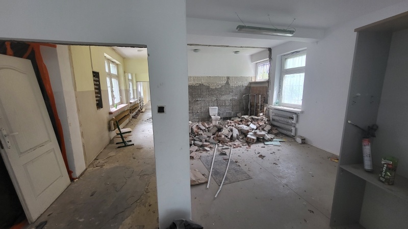 Na terenie szkoły trwają prace instalacyjne wewnątrz obiektu oraz rozbiórki poszczególnych elementów.