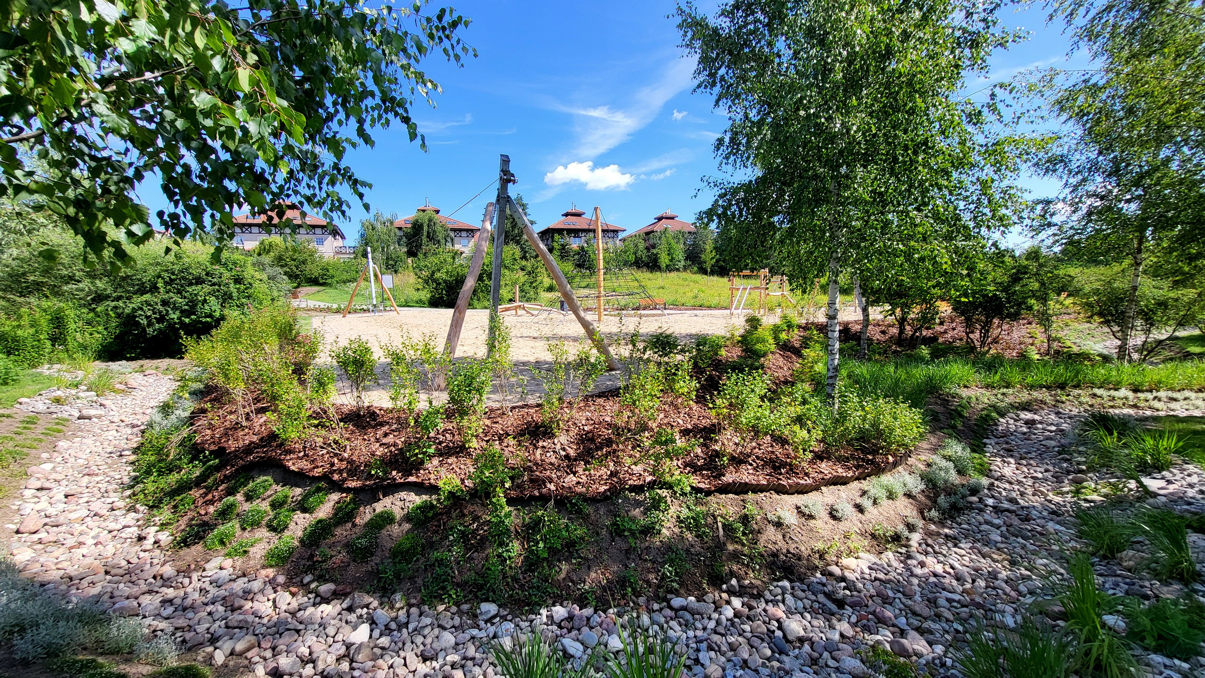 Na placu zabaw zamontowano zjazd linowy, linarium, huśtawki i ściankę wspinaczkową dla dzieci. Ponadto wykonano nowe trawniki wraz z nasadzeniami zieleni. Elementem zadania była również budowa tzw. suchego potoku, wyprowadzającego w razie potrzeby, nadmiar wody z ogrodu deszczowego dalej, w kierunku terenu niezabudowanego.