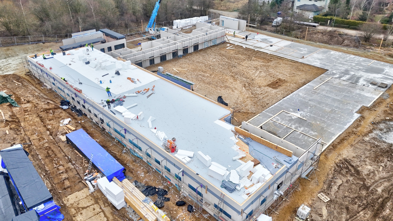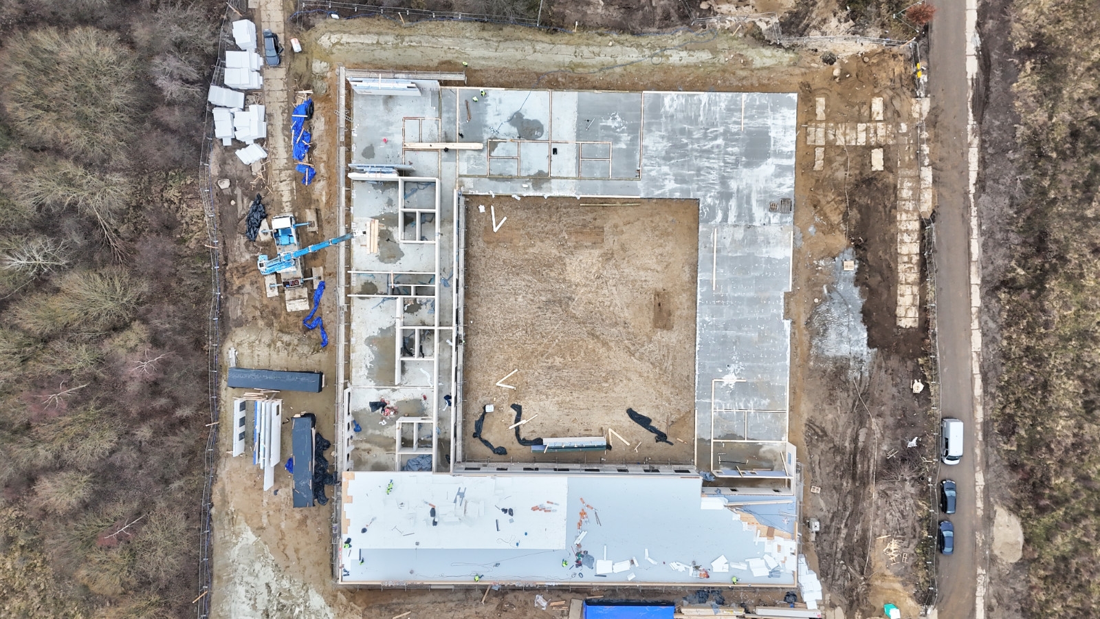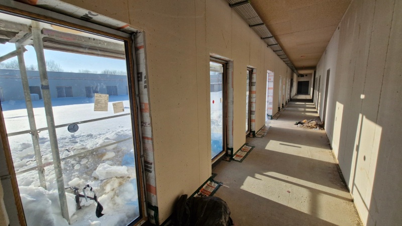 Wykonano już płytę fundamentową, a obecnie trwa montaż konstrukcji panelowej- prace postępują sekcjami, a ich zaawansowanie różni się w zależności od części obiektu. Aktualnym celem wykonawcy jest sprawne zakończenie montażu wszystkich elementów konstrukcyjnych, co umożliwi przejście do kolejnego etapu, czyli instalacji stolarki okiennej.
