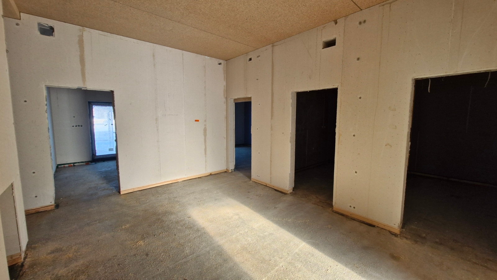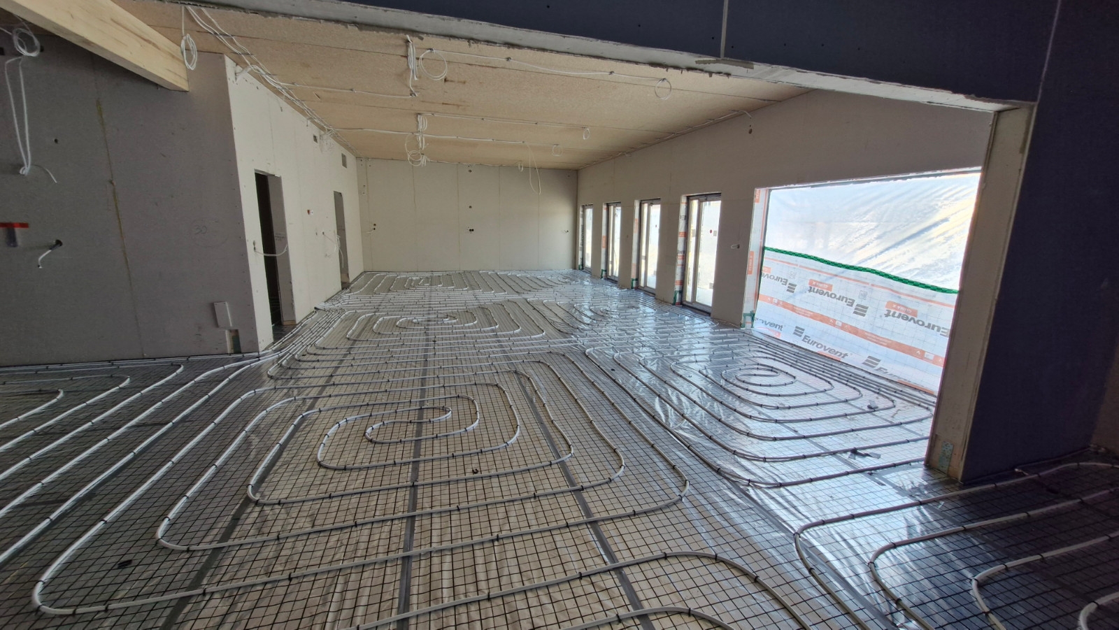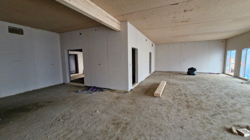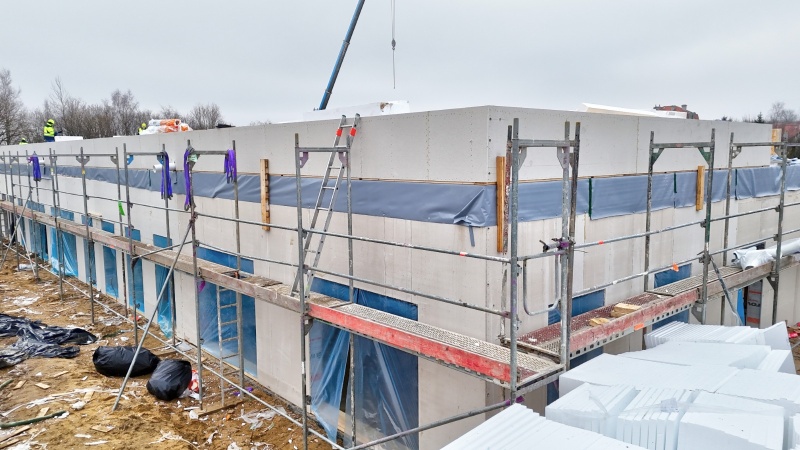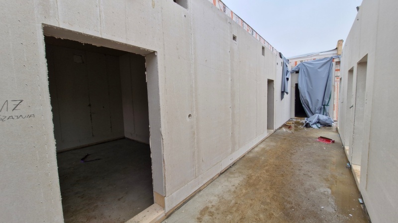 Zostały ustawione wszystkie elementy konstrukcyjne budynku, wstawiono stolarkę okienną oraz rozpoczęto prace instalacyjne ogrzewania podłogowego i instalacje elektryczne.