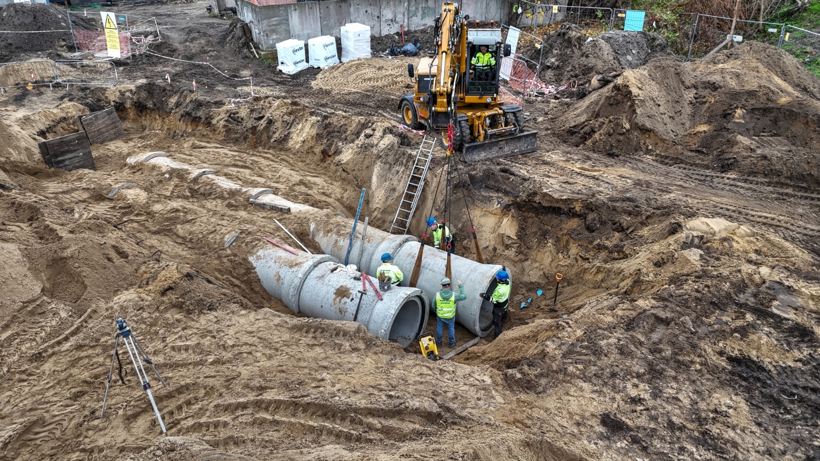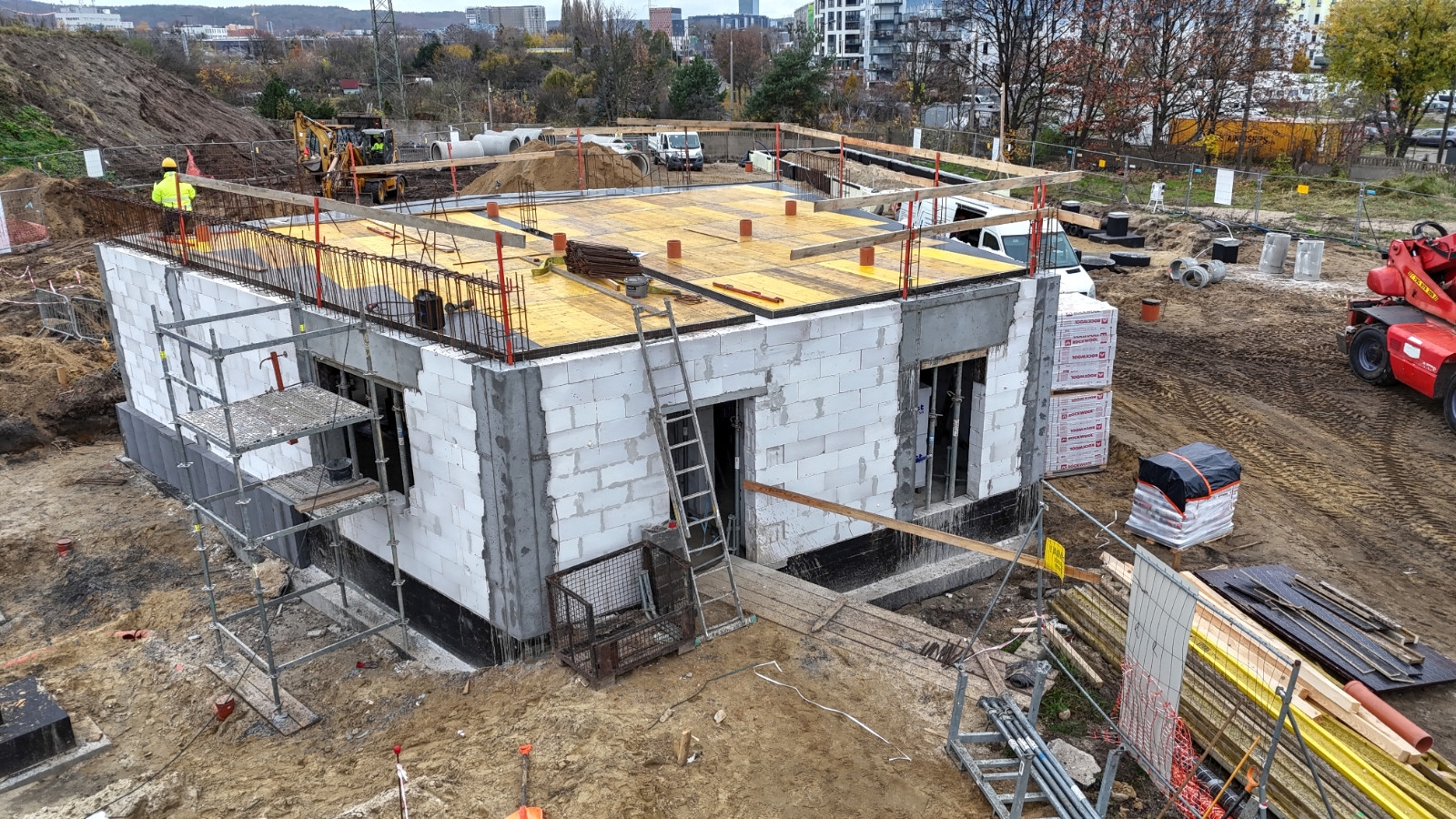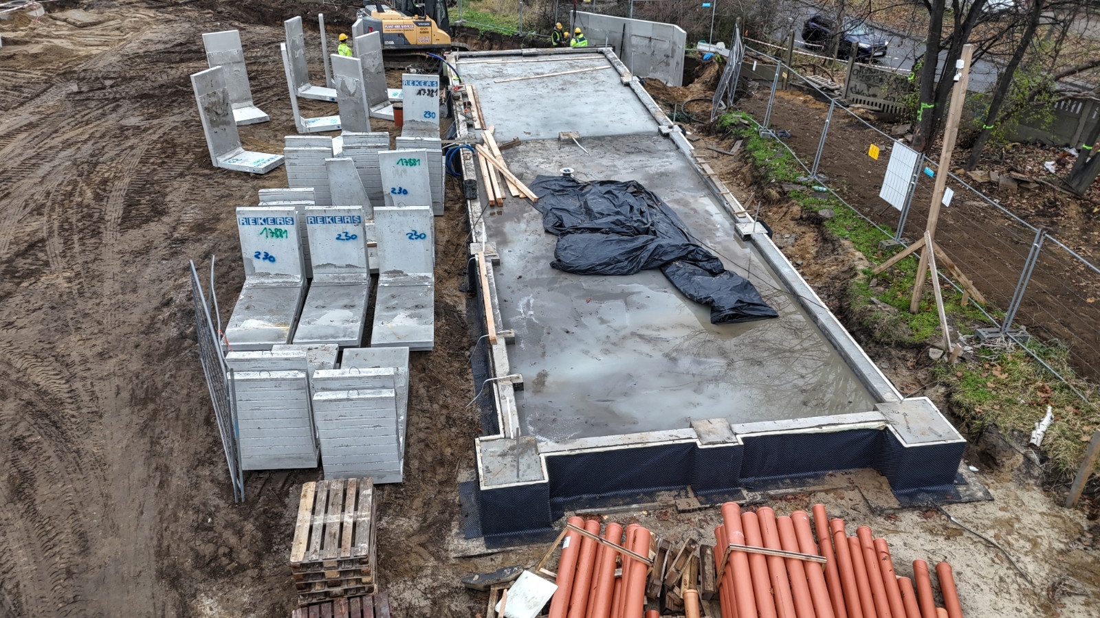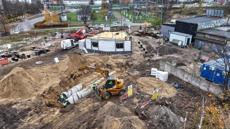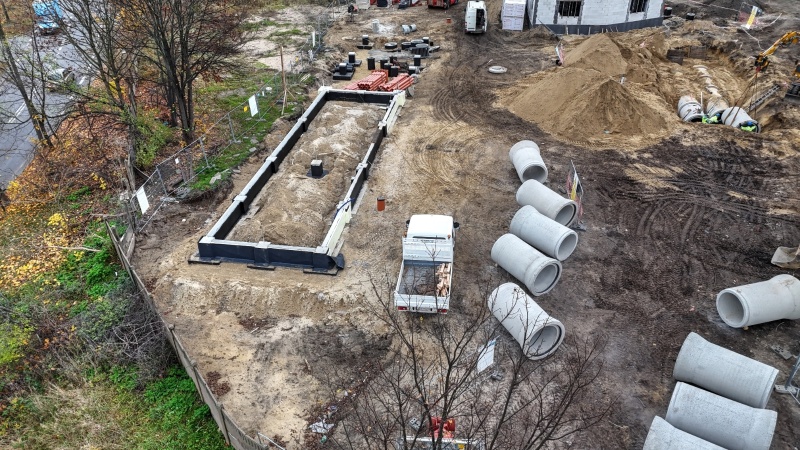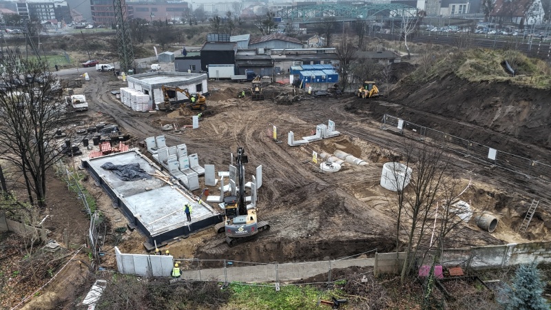 Aktualnie trwają prace związane między innymi z budową budynków. Wykonawca pracuje nad ułożeniem kanału deszczowego pod rampą. Ponadto, część sieci kanalizacji sanitarnej i deszczowej jest już gotowa. Zamontowano również tablice informujące o dofinansowaniu. Trwa także rozbiórka nasypu w północno- zachodniej części działki. Wkrótce rozpoczną się prace związane z wykonaniem murów oporowych.