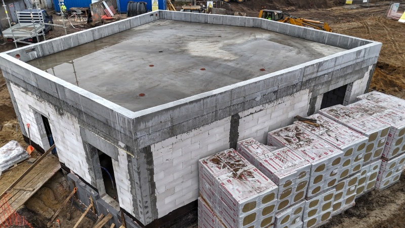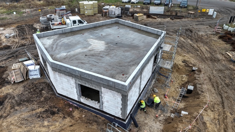 W ostatnim czasie wykonano izolację fundamentów oraz zakończono prace związane z zasypywaniem i zagęszczaniem gruntu pod posadzkę w jednym z budynków. Zadbano również o ściany nośne, podciągi i strop nad parterem i attykę w kolejnym. Ułożone zostały także rury kanalizacji deszczowej.