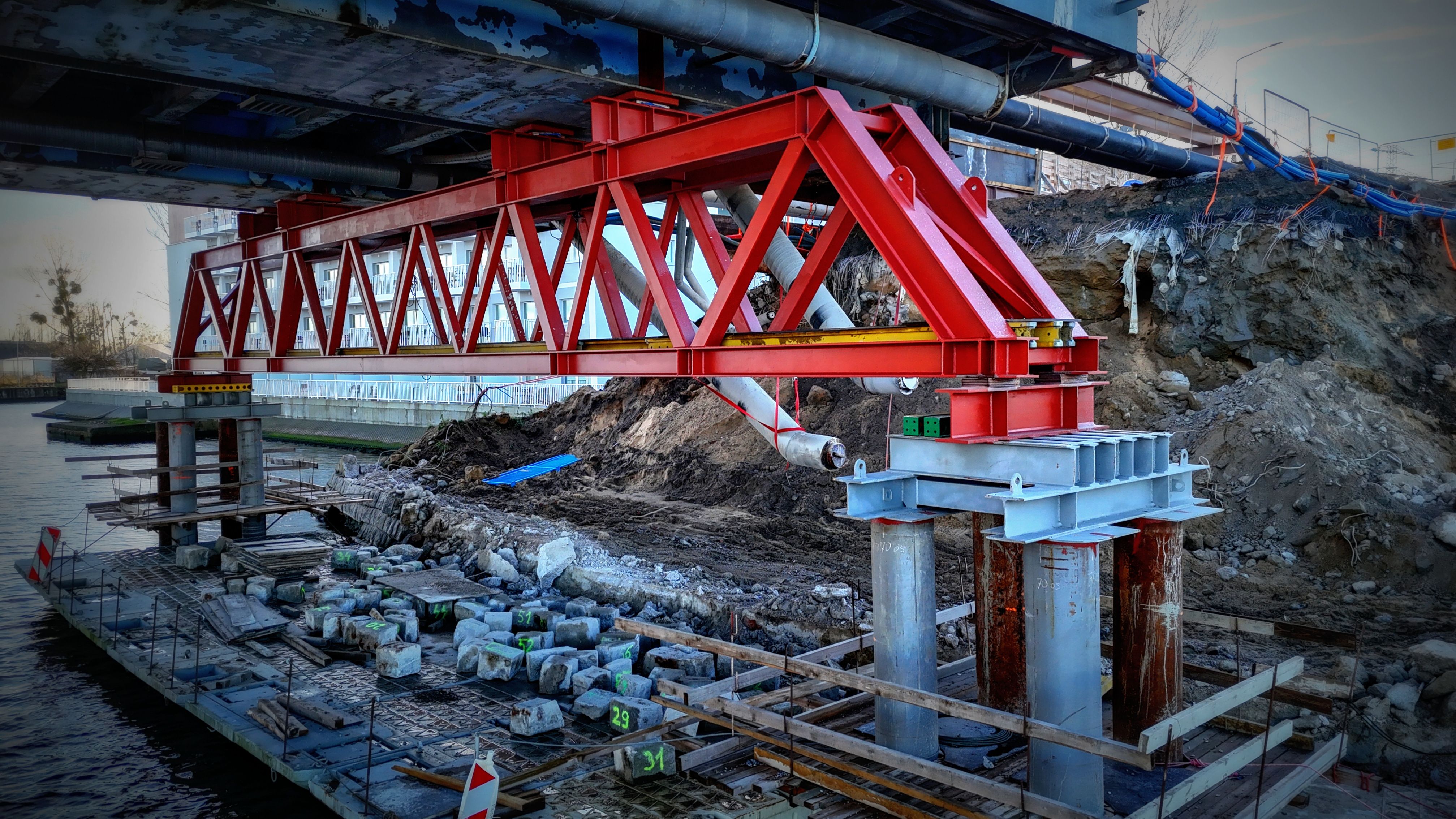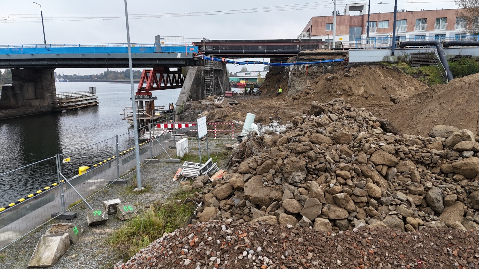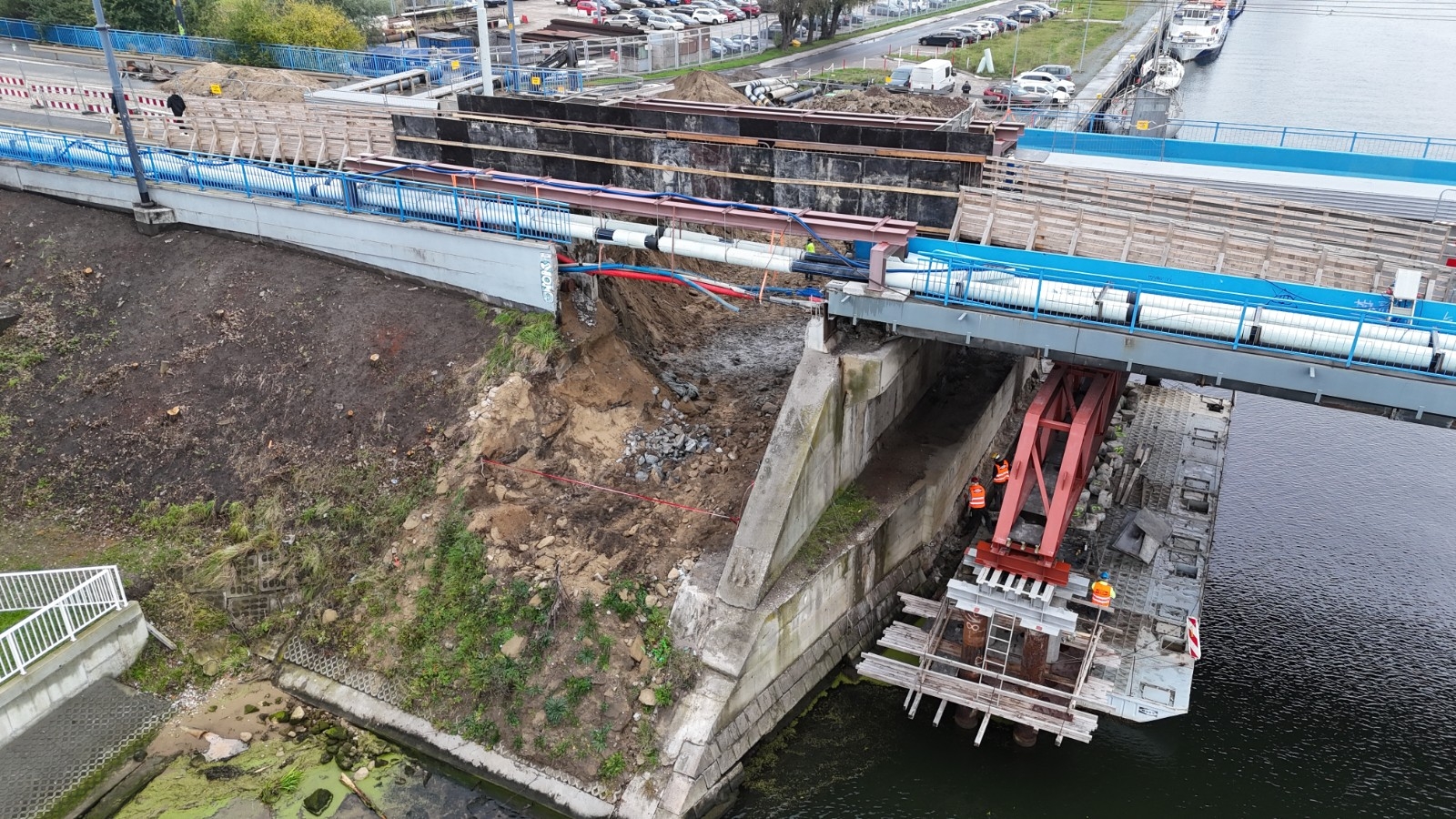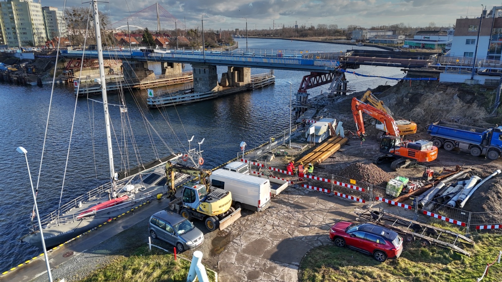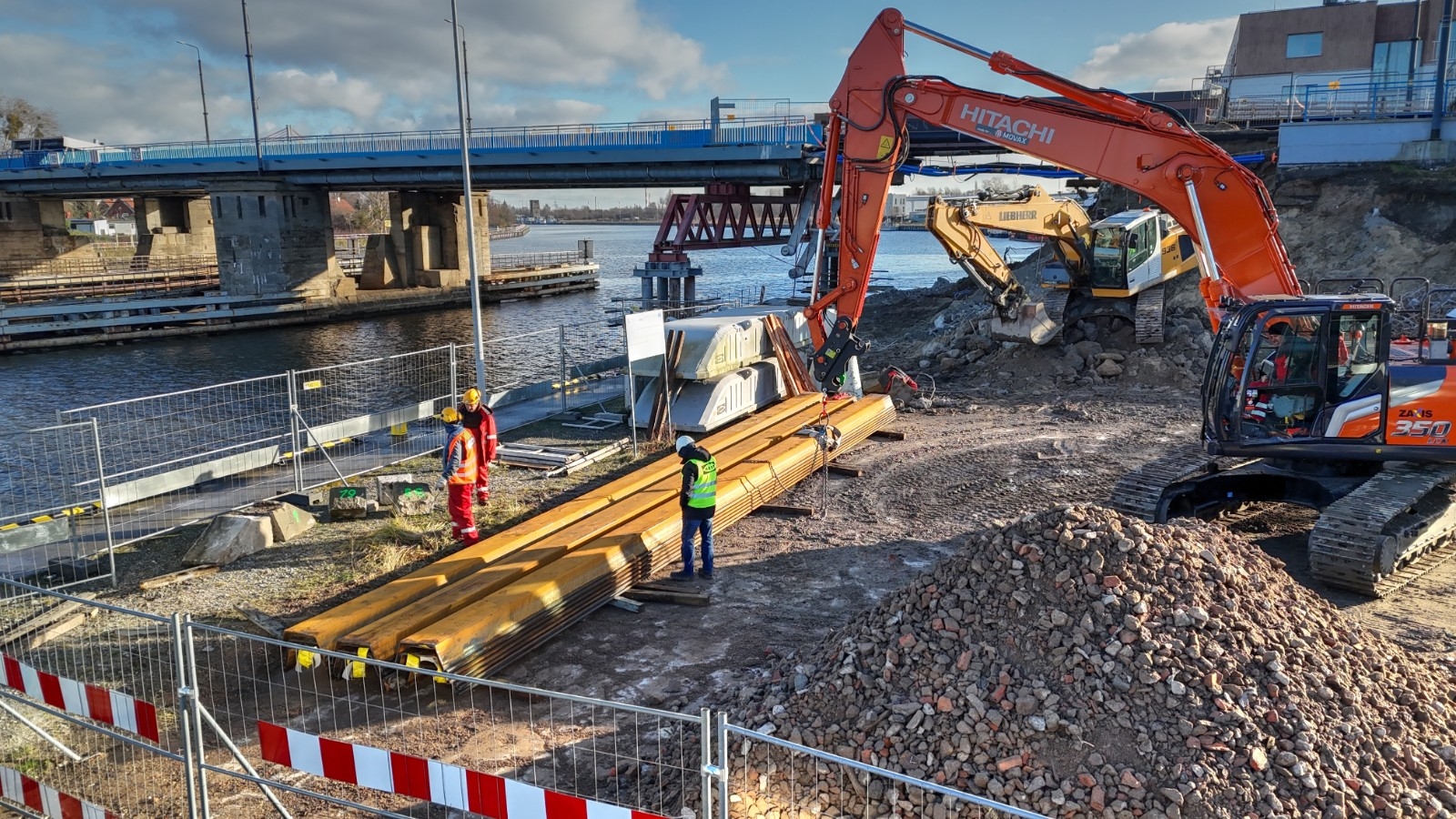 Na budowie trwają rozbiórki instalacji i kanału teletechnicznego i ich zabezpieczanie. Ponadto wykonywane są prace związane z wodowaniem pontonów, po których poruszać się będą robotnicy. Prowadzona jest także rozbiórka muru oporowego.