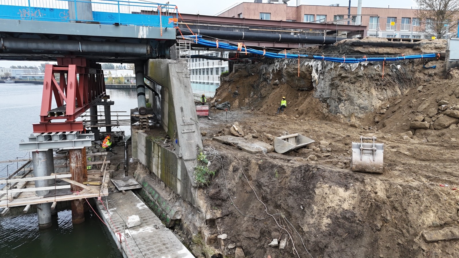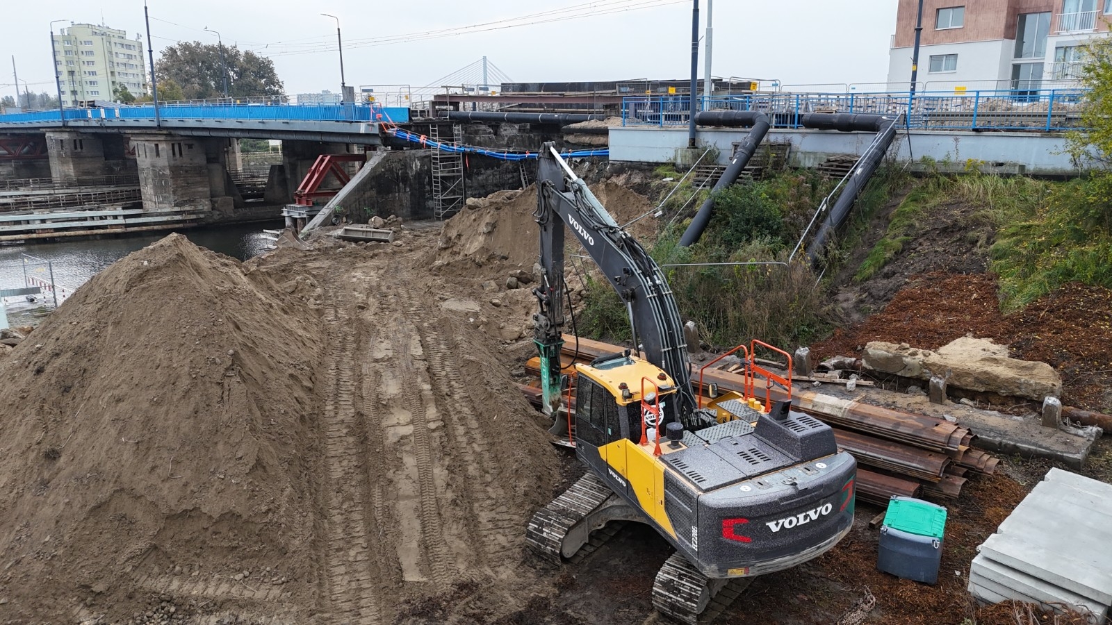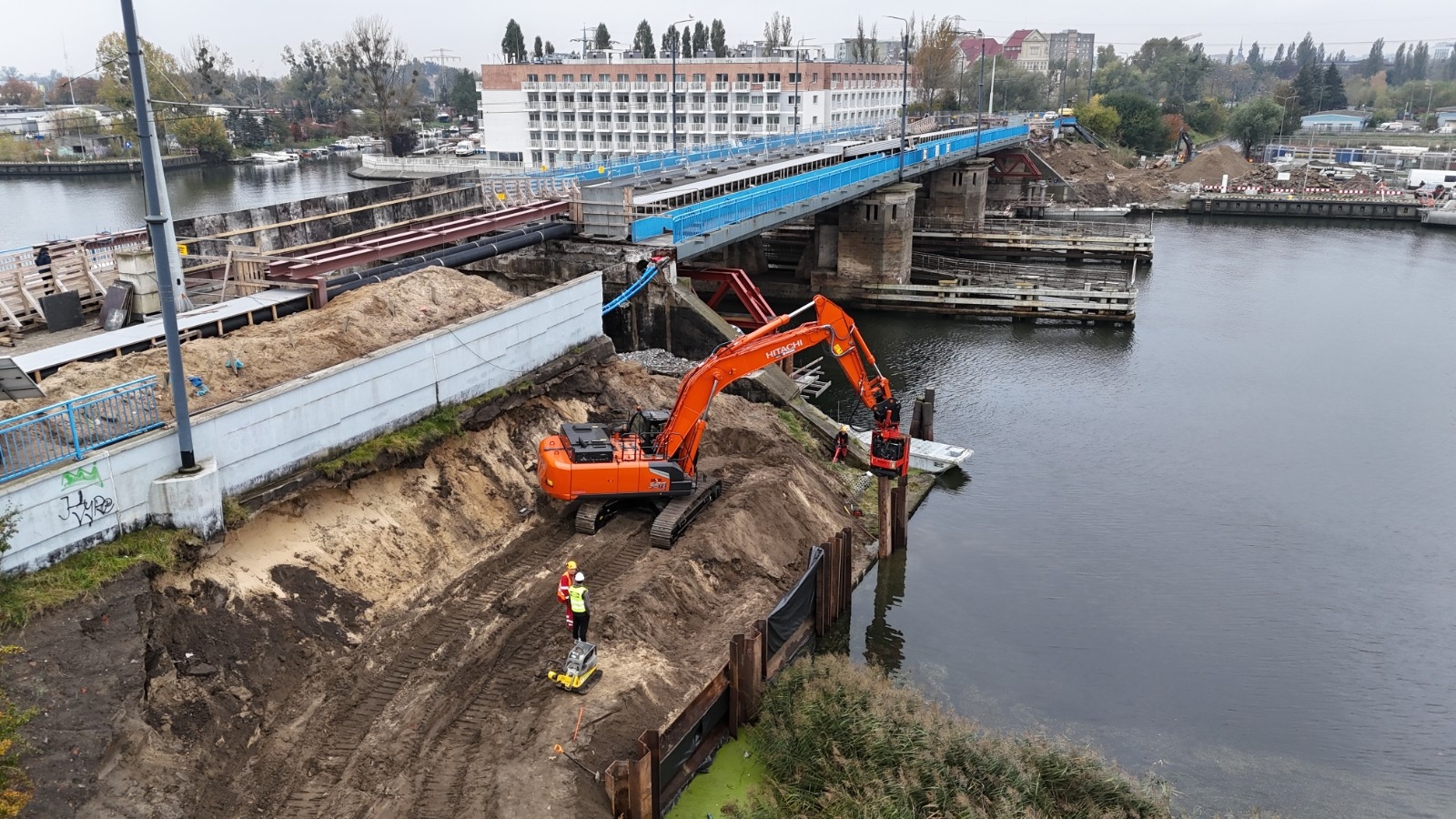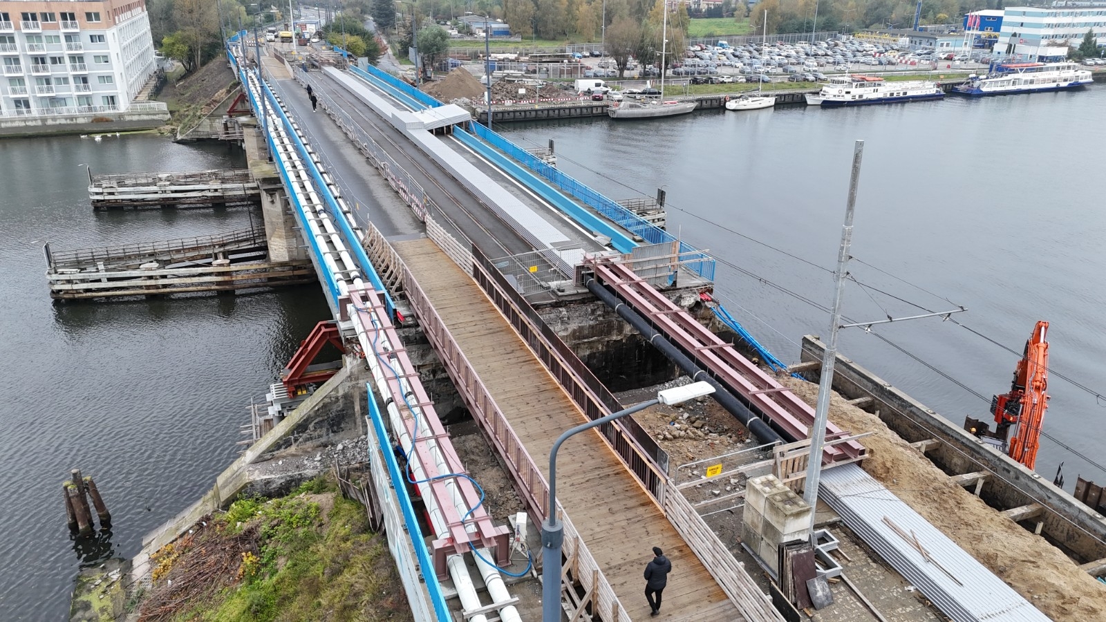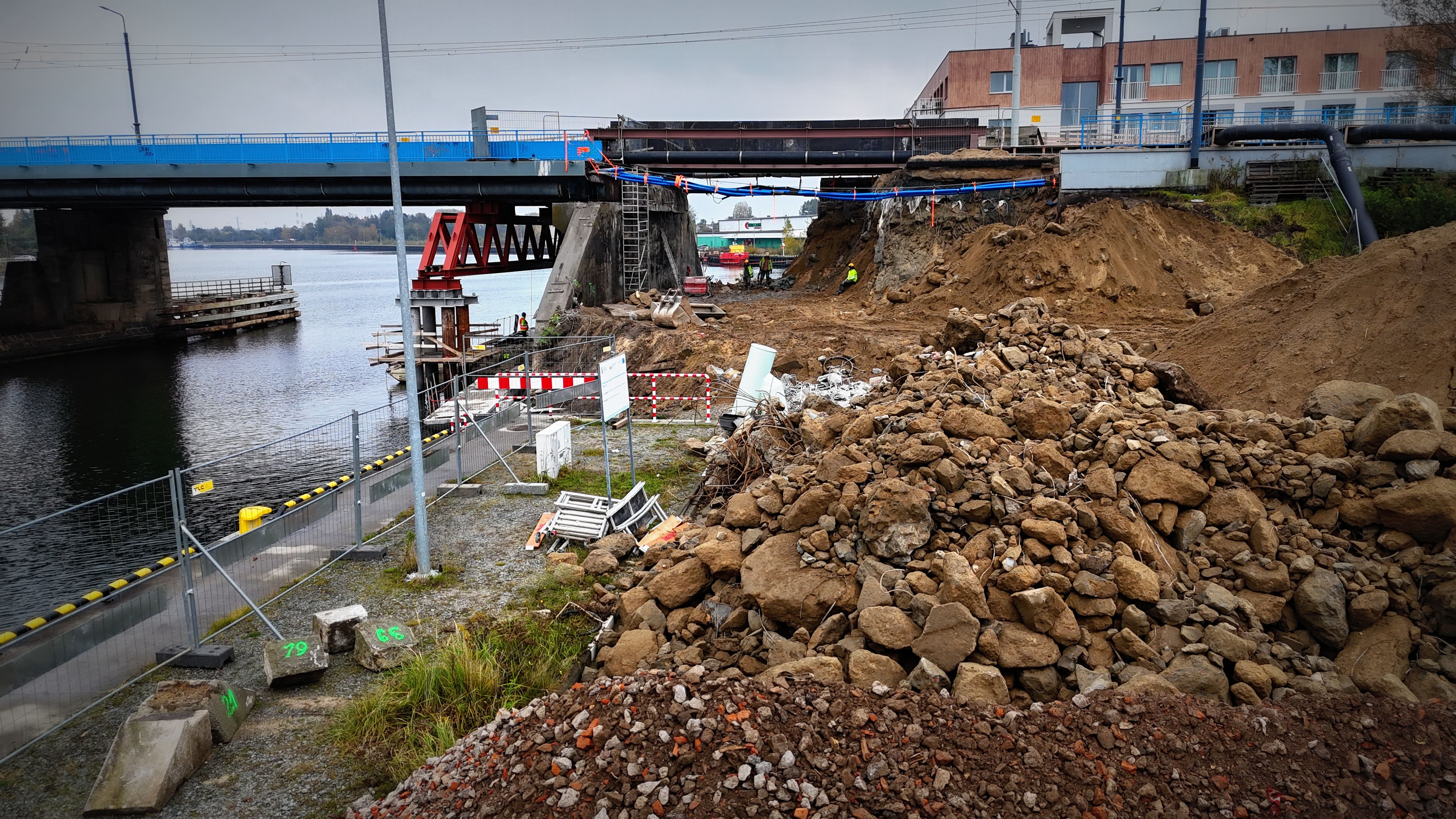 Na budowie trwają rozbiórki instalacji i kanału teletechnicznego i ich zabezpieczanie. Ponadto wykonywane są prace związane z wodowaniem pontonów, po których poruszać się będą robotnicy. Prowadzona jest także rozbiórka muru oporowego.