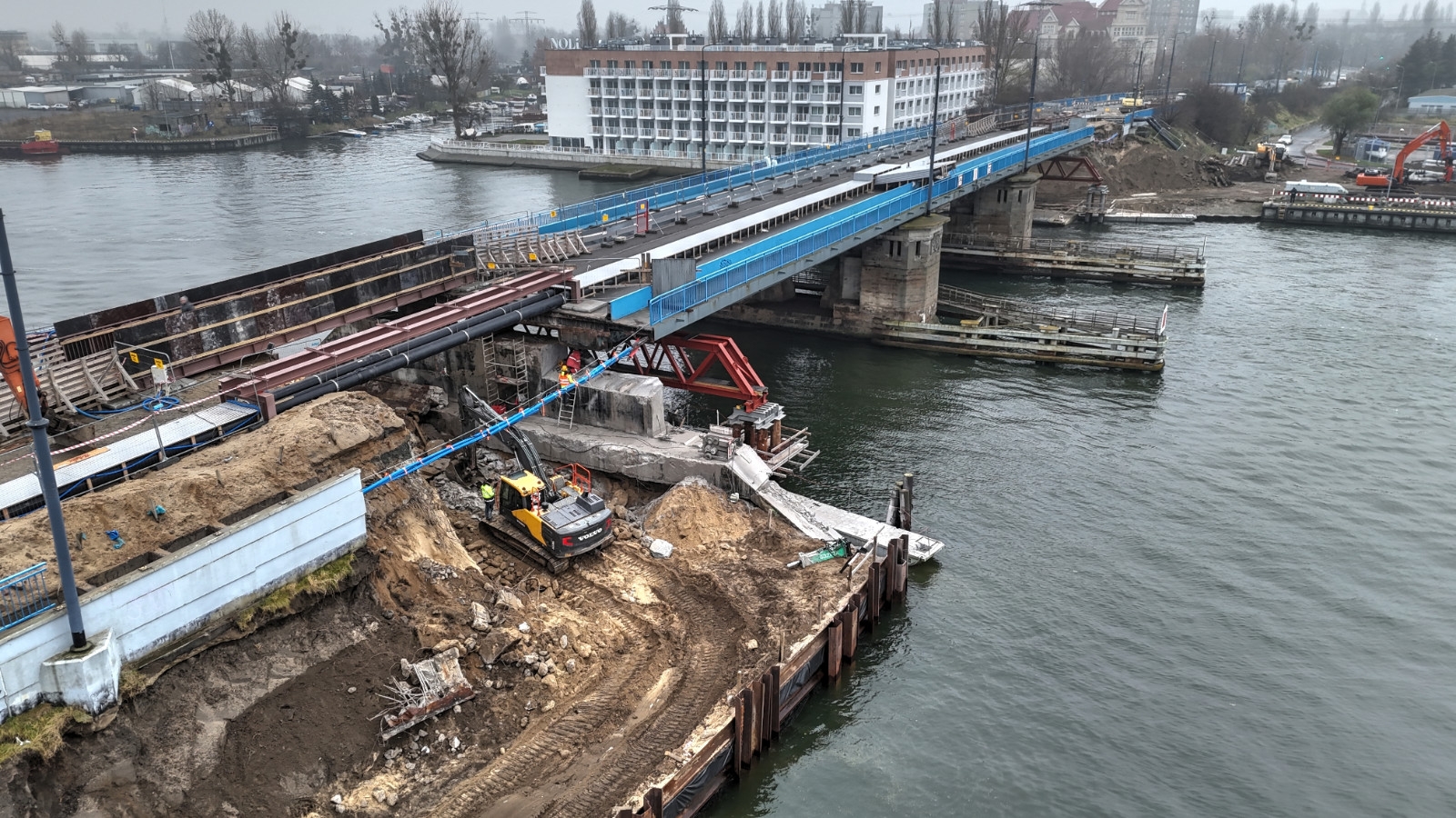 Wciąż trwa proces rozbiórki przyczółków. Ponadto, wykonawca prowadzi prace przygotowawcze przed planowanym pogrążaniem ścianek szczelnych. Dzięki wspomnianym ściankom podpory mostu zostaną zabezpieczone przed erozją i podmywaniem.