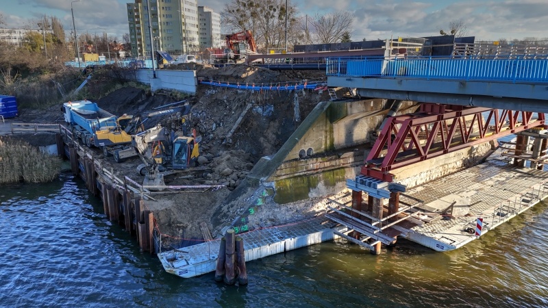 Na terenie budowy trwają rozbióki przyczółków z obu stron mostu.