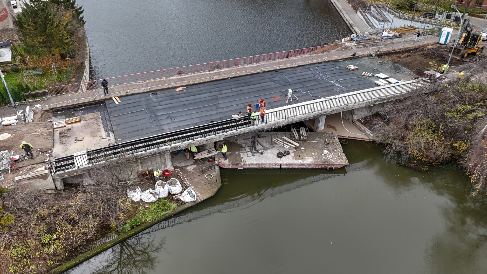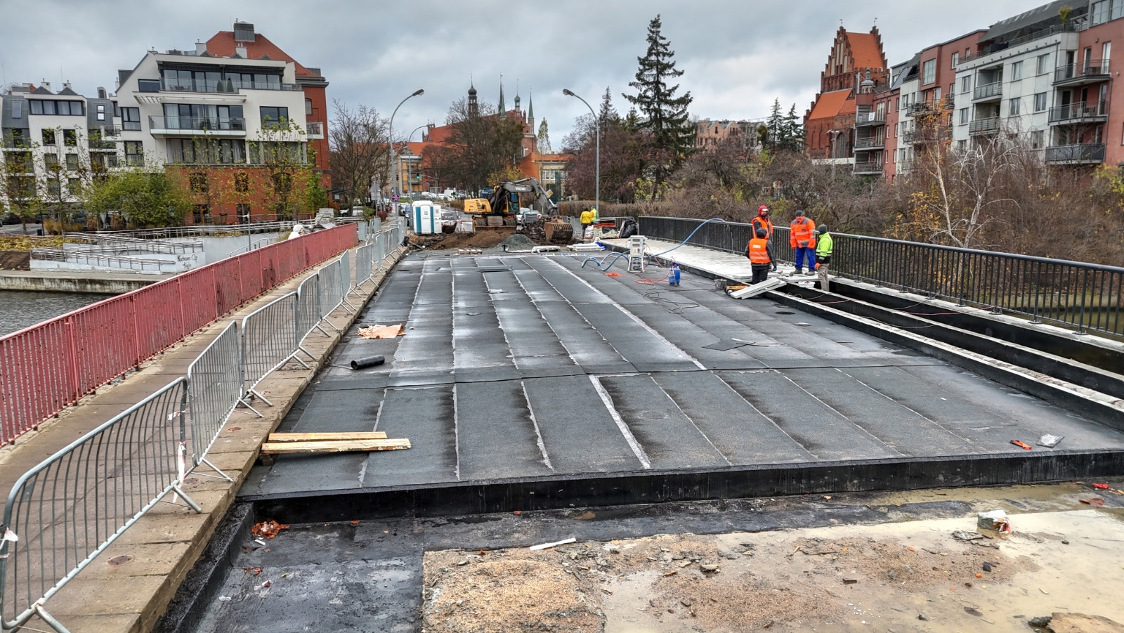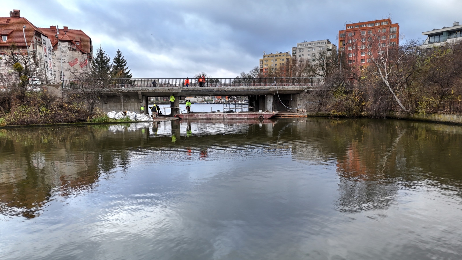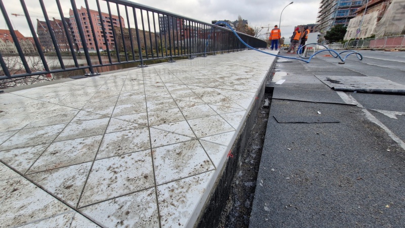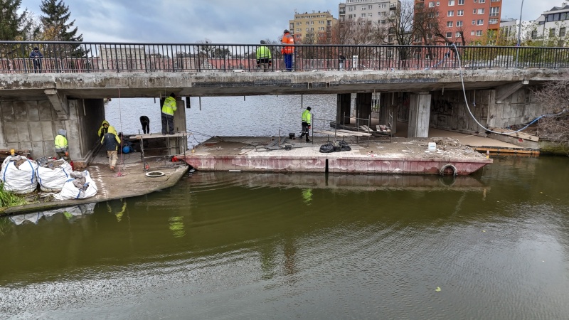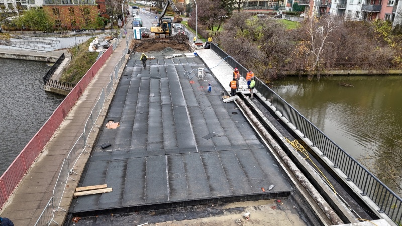W ostatnim czasie wykonano szereg istotnych prac. Zrealizowano nawierzchniowo-izolacyjne zabezpieczenie pod obiektem od strony ul. Okopowej oraz wykonano zbrojenie płyty nabrzeża od strony ul. Łąkowej. Na północnej stronie mostu zamontowano prefabrykowane płyty chodnikowe. Dodatkowo wykonano roboty drogowe, obejmujące rozbiórkę istniejącej nawierzchni i jej przekładkę od strony ul. Okopowej.