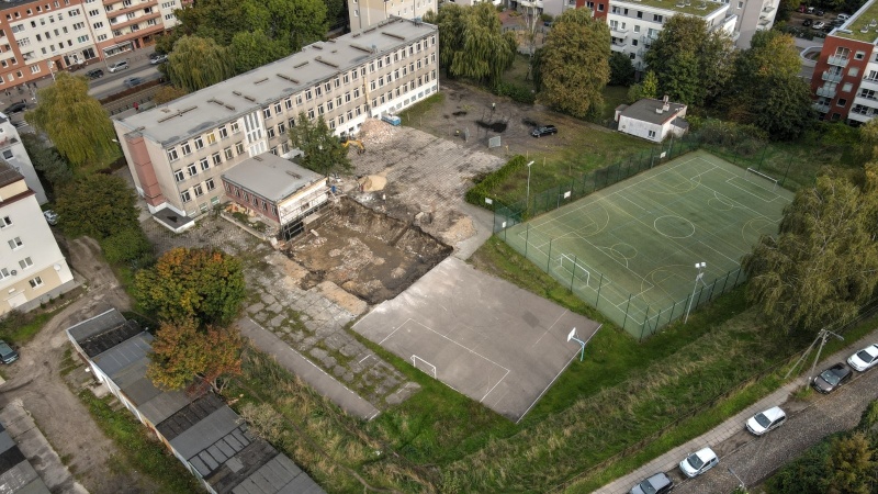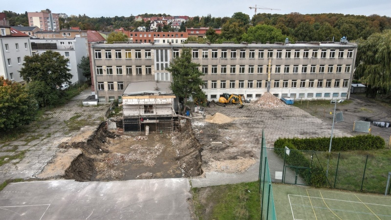 Na terenie budowy rozebrano starą salkę gimnastyczną. W środku obiektu usuwane są ścianki działowe i zrywane posadzki.