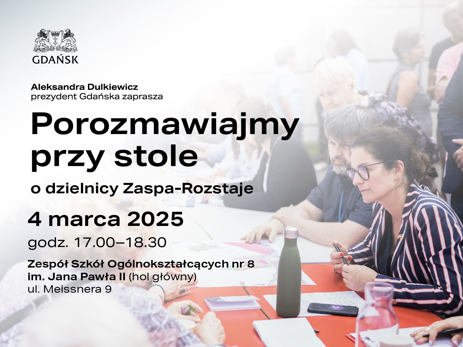 W dniu 4 marca 2025 r. w godz. 17.00-18.30 odbędzie się spotkanie Prezydent Aleksandry Dulkiewicz z cyklu: „Porozmawiajmy przy stole” z mieszkańcami dzielnicy Zaspa-Rozstaje w Zespole Szkół Ogólnokształcących nr 8 w Gdańsku im. Jana Pawła II przy ul. Meissnera 9 (hol główny).
