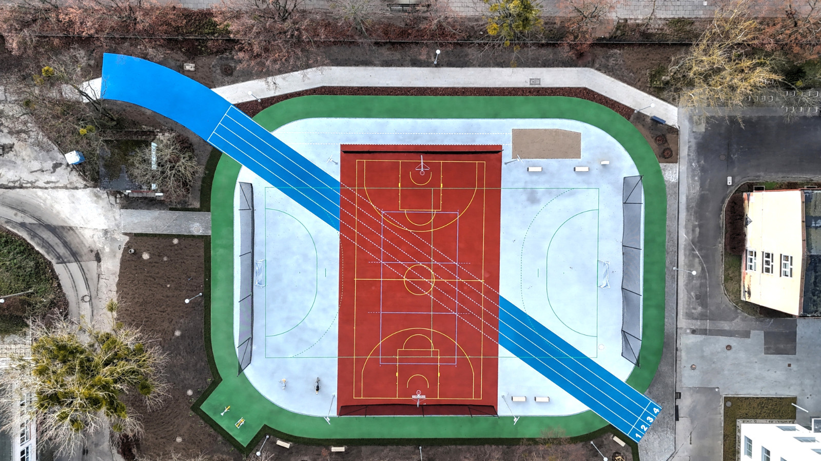 Dodatkowo zamontowano elementy małej architektury, takie jak ławki, kosze na śmieci czy stojaki na rowery, co podniosło komfort użytkowników. W ramach robót wykonano również instalacje oświetleniowe dla boiska i terenu oraz system odwodnienia, zapewniający prawidłowe odprowadzanie wód opadowych.