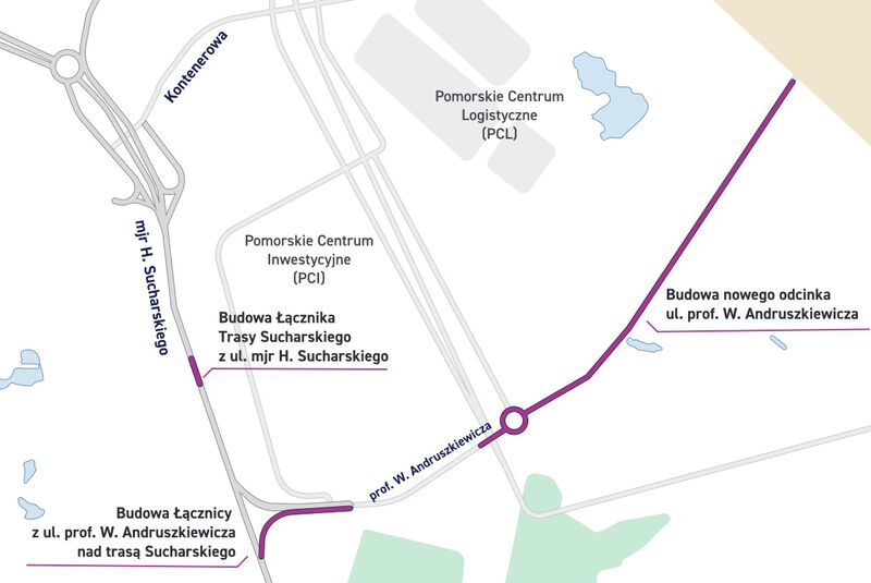 Przetarg dotyczył będzie także zaprojektowanie części zakresu - sieci wodociągowej i kanalizacji sanitarnej wzdłuż ul. Andruszkiewicza, a także łącznicy ul. Andruszkiewicza z Trasą Sucharskiego w formie wiaduktu wraz z budową drogi łączącej Trasę Sucharskiego z ul. Sucharskiego - tzw. „węzła dzielnicowego”. Prace projektowe mają potrwać ok. 2 lat od momentu podpisania umowy.