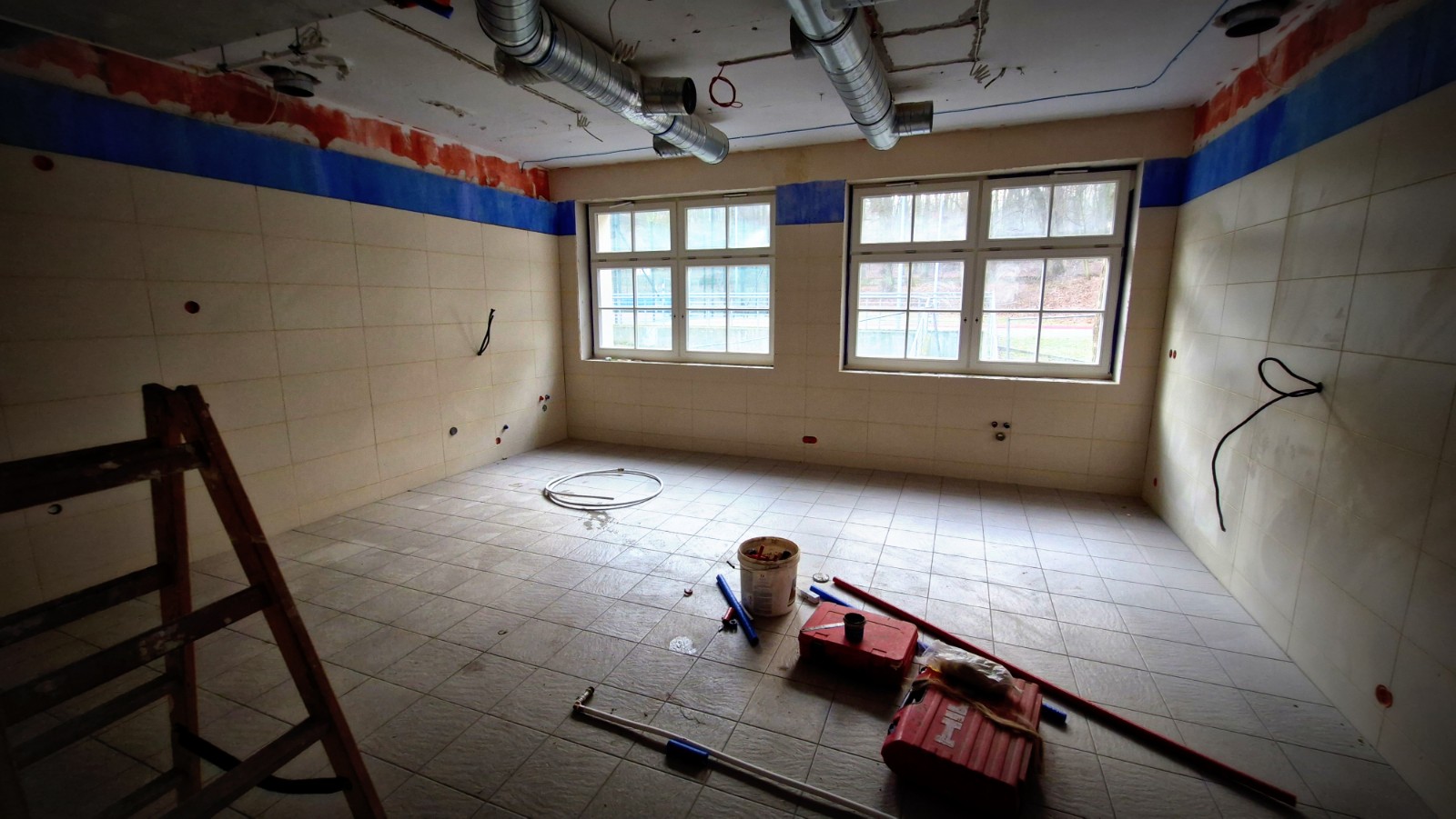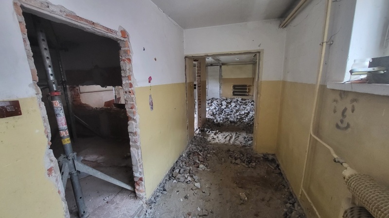 Na terenie szkoły trwają prace instalacyjne wewnątrz obiektu oraz rozbiórki poszczególnych elementów.