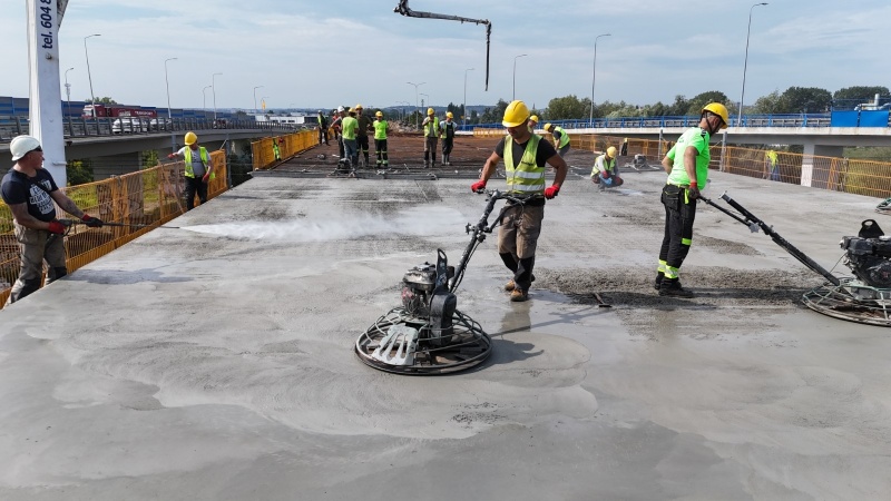 Zabetonowano już całą płytę mostu. Obecnie prace koncentrują się na montażu desek gzymsowych, układaniu krawężników, montażu elementów tzw. kap chodnikowch.