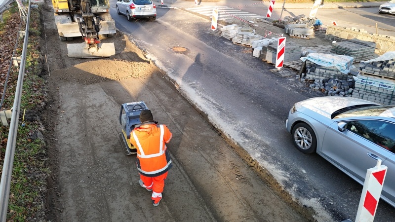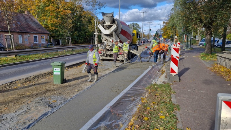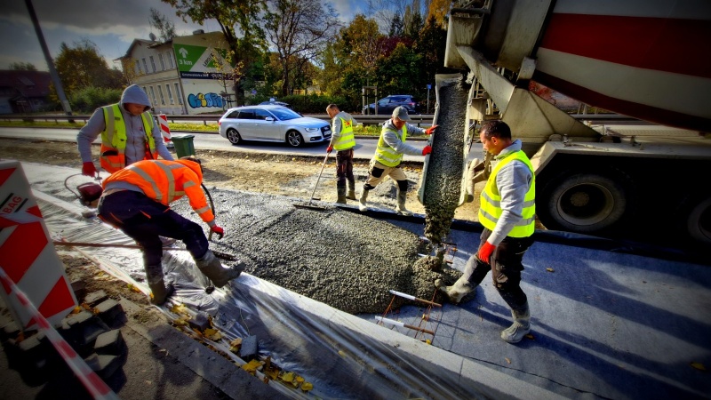 Trwa układanie warst podbudowy lewego pasa jezdni. Wykonano również betonową konstrukcję jezdni na przystanku.