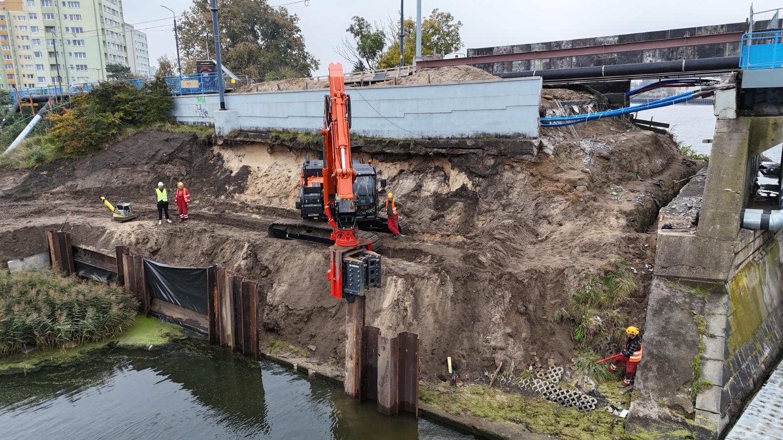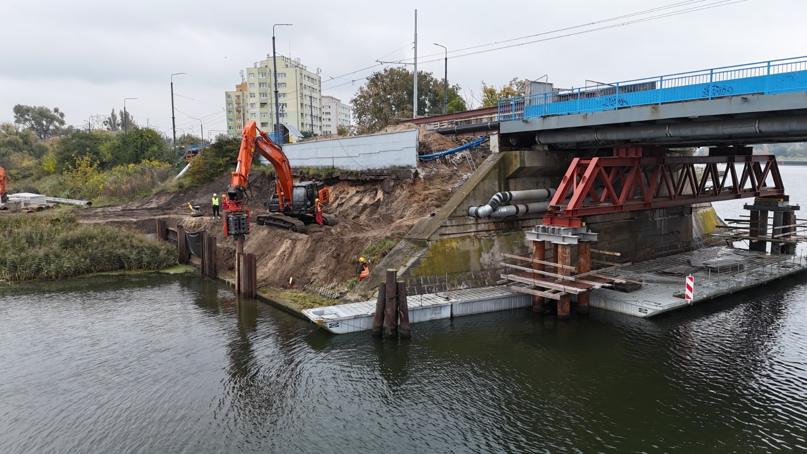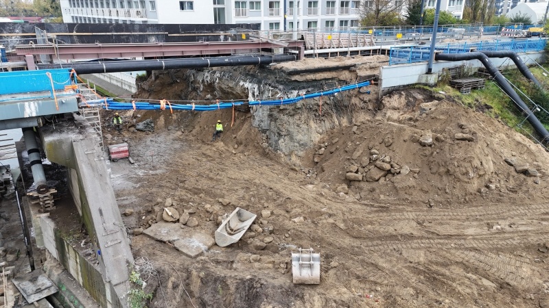 Na budowie trwają rozbiórki instalacji i kanału teletechnicznego i ich zabezpieczanie. Ponadto wykonywane są prace związane z wodowaniem pontonów, po których poruszać się będą robotnicy. Prowadzona jest także rozbiórka muru oporowego.