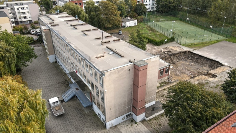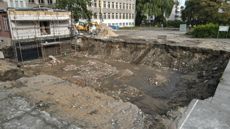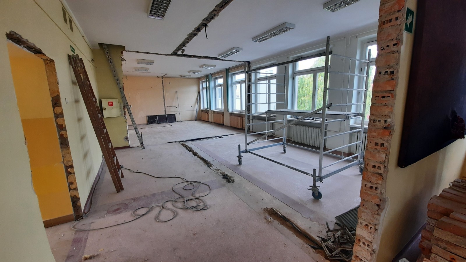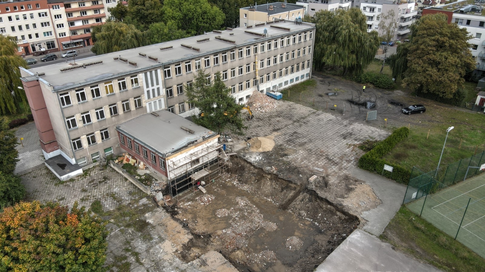 Na terenie budowy rozebrano starą salkę gimnastyczną. W środku obiektu usuwane są ścianki działowe i zrywane posadzki.